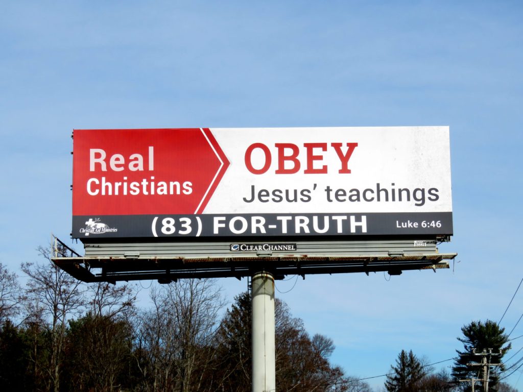 The billboard proclaimed “Real Christians OBEY Jesus’ teachings,” citing Luke 6:46 as a reference. At face value that is the goal of all Christians, to obey Jesus, right? But it is this qualifying word “real” that indicates this is a loaded statement and more than just a reminder to be good Christians. The writer doesn’t want you to just be any kind of Christian. No, they want you to be a “real Christians” and quite obviously, unless this writer is at odds with themselves, it means to be like them.